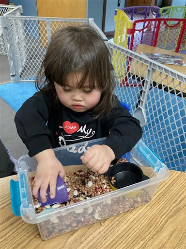 Photo: Alisya Yusman uses her sense of touch to explore items in a bin. She uses her hands together to scoop and pour the beans, and her fingertips to pick up one at a time. All of this is happening while Alisya is using flexible seating at the table.