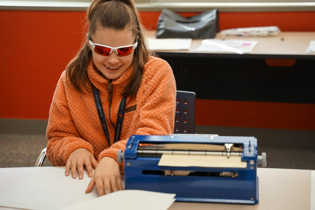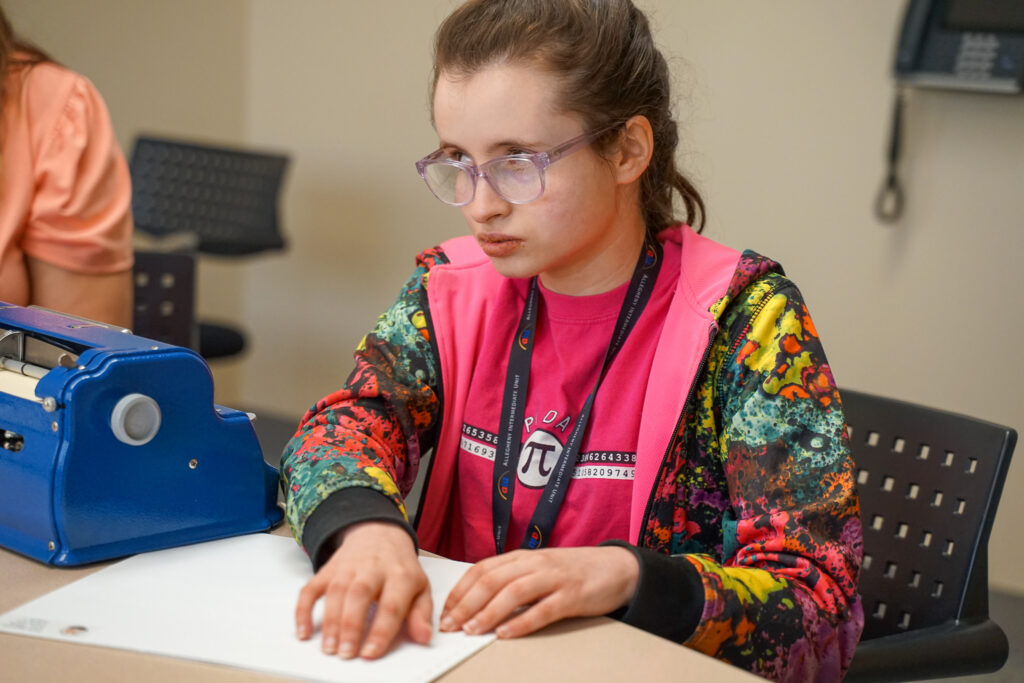 Greg Lazur, AIU BVISP TVI and COMS, guided the girls through their challenge. During a break, Lazur explained that braille is more like a code than a language. “They are using a language they have already learned and assigning code to it,” he said. Braille can be used to transcribe many languages like English, Spanish, Chinese, and others.