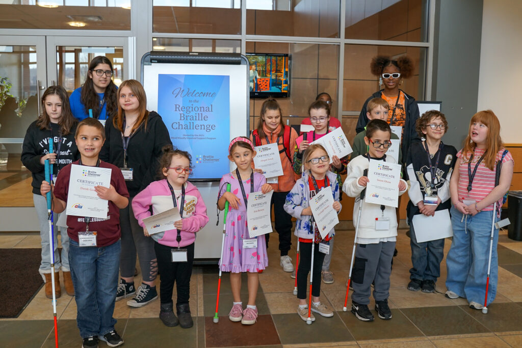 The lobby of the AIU was buzzing with excitement on Friday, March 14 as students of all ages gathered for the Regional Braille Challenge, hosted by the AIU Blind and Visually Impaired Support Program (BVISP). Some students were guided by teachers, others navigated their way with canes, and all were thrilled to collect braille agendas and tactile maps of the building created just for them.
