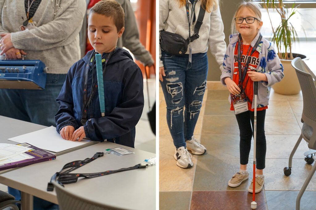 Everleigh Moore, first grader from Elizabeth Forward School District, was especially delighted to have her nametag embossed in braille and attached to her very own lanyard. She raised the plastic sleeve to tap with everyone she passed. “We match!” she said with each clink.