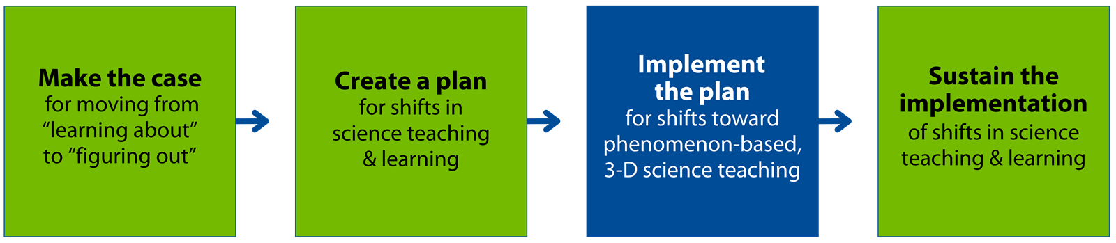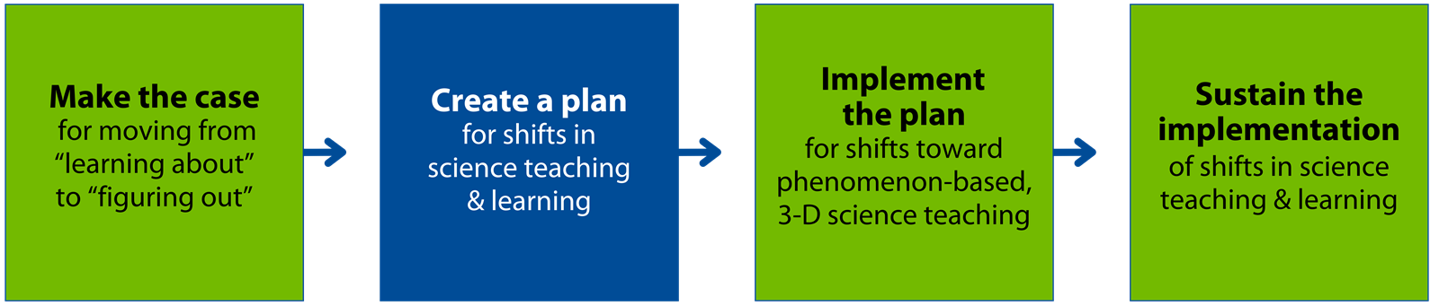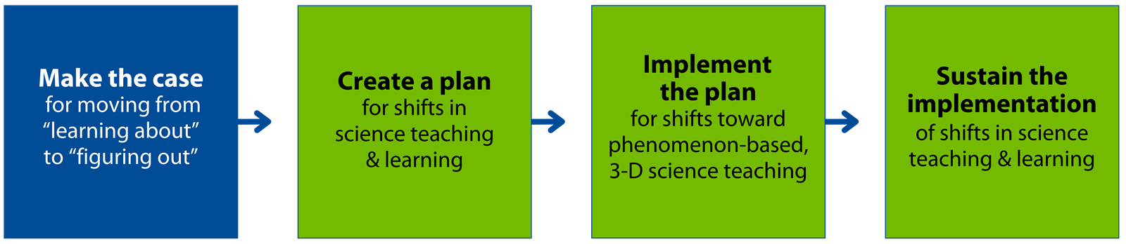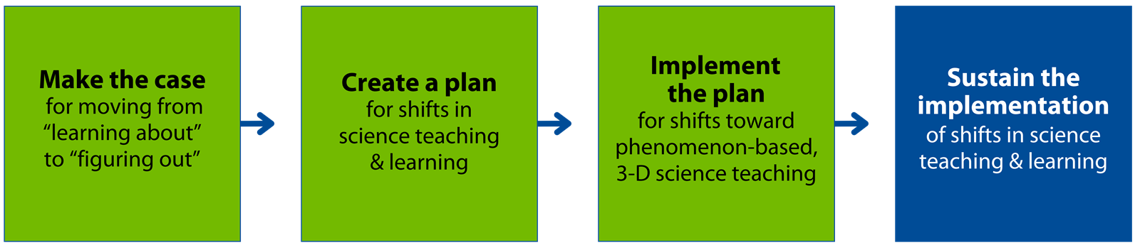 1. Make the case for moving from "learning about" to "Figuring out" 2. Create a plan for shifts in science teaching & learning 3. Implement the plan for shifts toward phenomenon-based, 3-D science teaching 4. Sustain the implementation of shifts in science teaching & learning